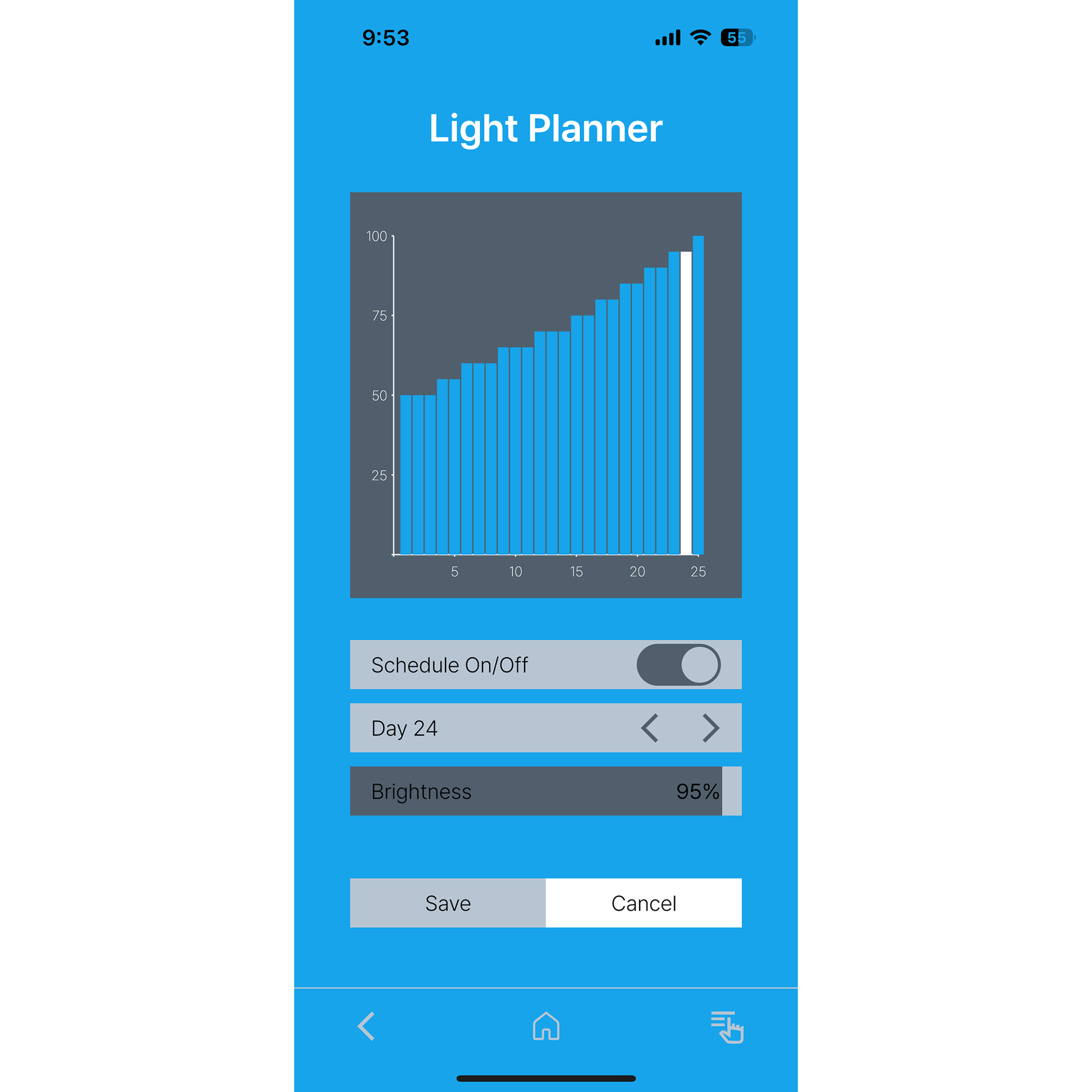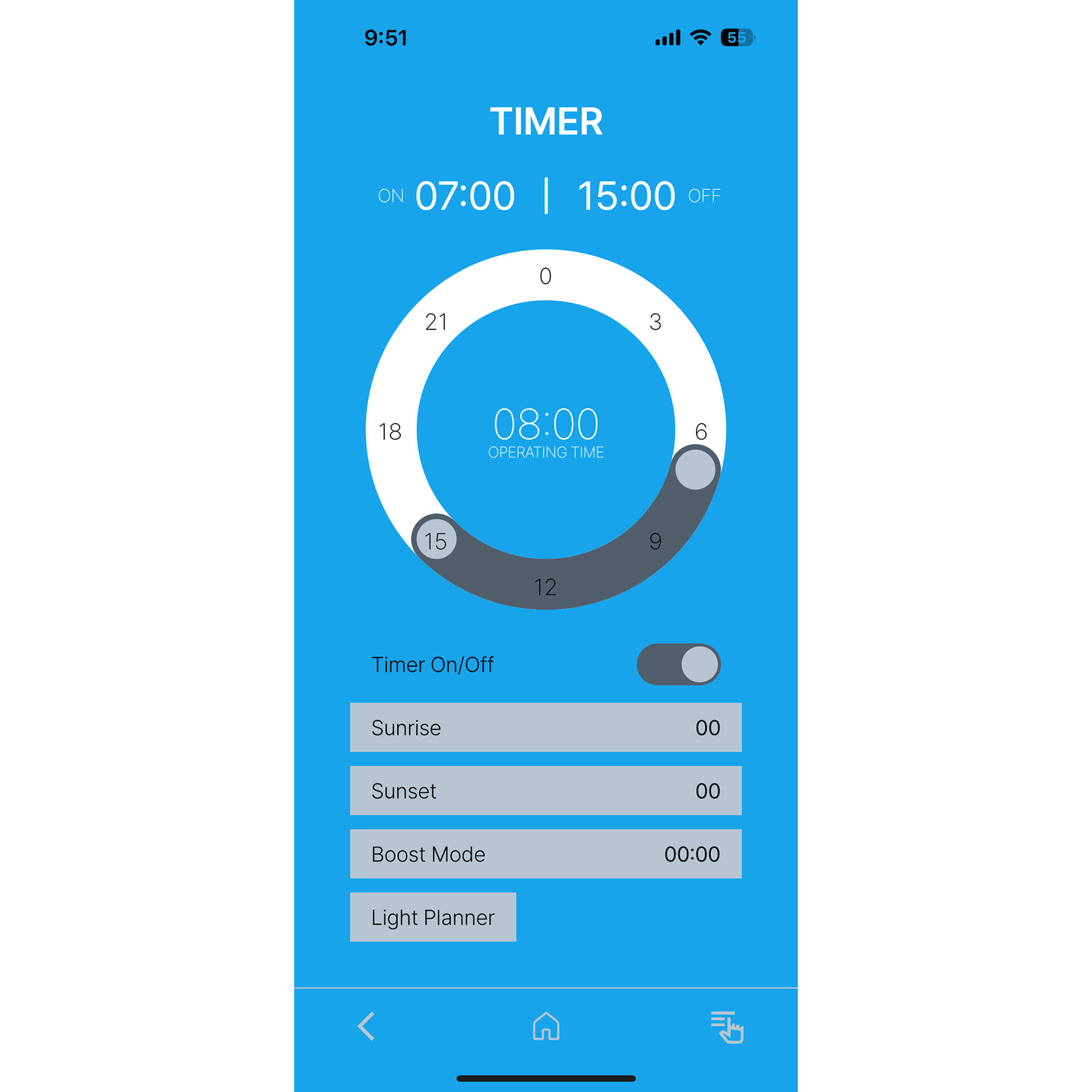 The B Line comes with the LightControl Standard Bluetooth controller as standard. Brightness adjustment, timer, sunrise & sunset effect, and the Light Planner are essential features for aquarium lighting. These functions allow users to control their lights more easily and reliably.